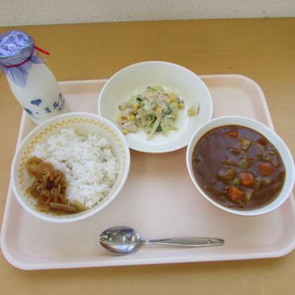 むぎごはん ぎゅうにゅう カレーライス ツナサラダ たくじょうマヨネーズ ふくじんづけ