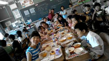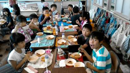 4年2組の給食の様子です。今日は肉じゃがと鶏肉がとってもおいしいそうです。