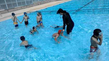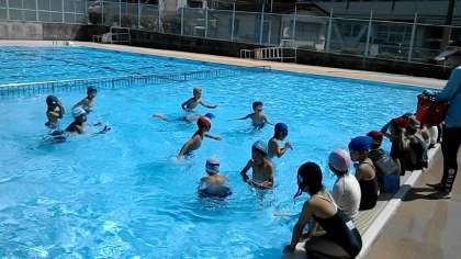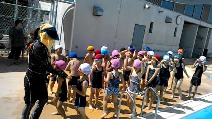 今日も朝からいい天気です。1年生は気持ちよさそうにプールで水泳の授業を受けています。