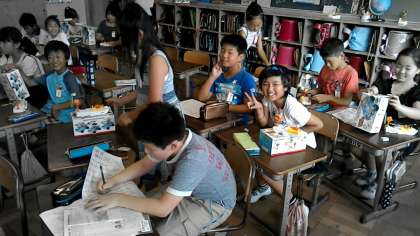 4年1組では,漢字のテストをしつつ,理科の教材を組み立てていました。みんな一生懸命に取り組んでいました。