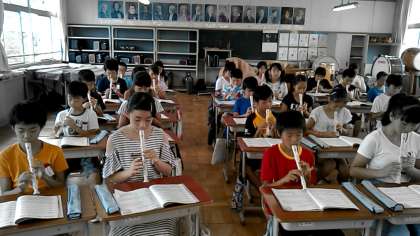 6年1組の音楽です。「カノン」をパートごとに分かれて演奏しています。