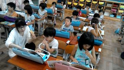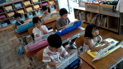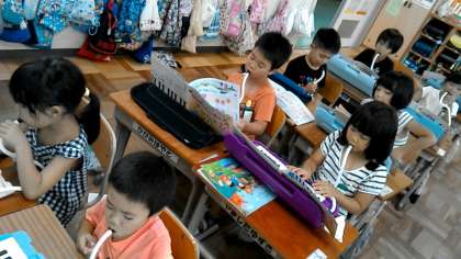 1年1組の音楽の授業です。ピアニカの練習をしています。