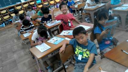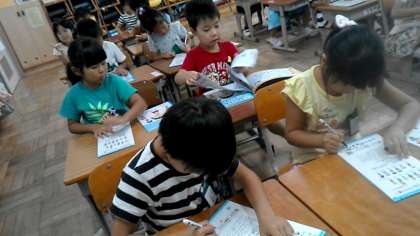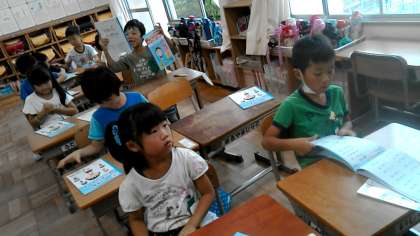 1年2組では,2学期の係を決めた後で,教材を配っていました。上手に名前が書けたかな?