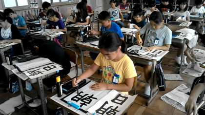 5年3組の書写の授業です。「朝日」を書いています。画数の違う字を,バランスよく書くのが難しいです。