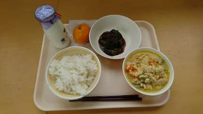 ぎゅうにゅう ごはん こうやどうふのたまごとじ なすのにくみそかけ れいとうみかん