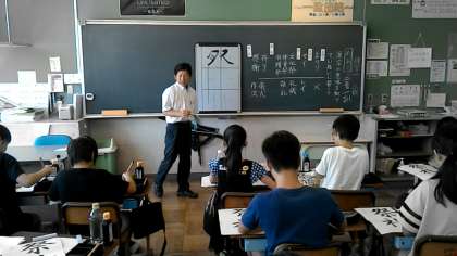 6年3組の書写の授業です。田島先生に書き方のポイントを教わっています。