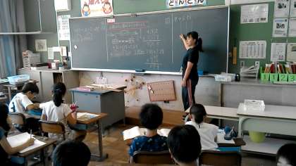 4年2組の算数の授業です。小数のたし算をひっ算で計算しています。