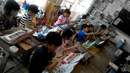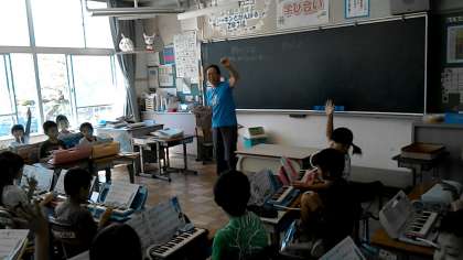 2年3組の音楽の授業です。「すいかのめいさんち」をピアニカで練習しています。