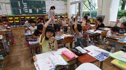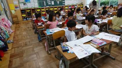 1年1組の算数の授業です。たし算の応用問題を頑張っています。