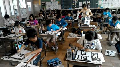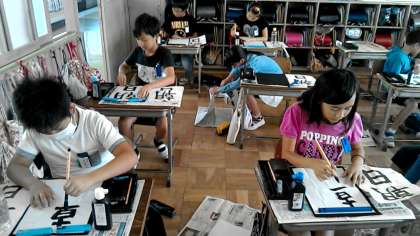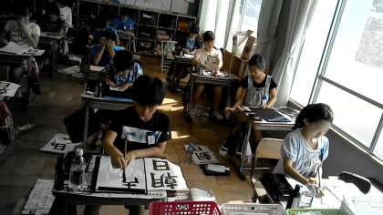 5年1組の書写の授業です。「朝日」の清書をしています。前回よりも上手にかけたかな?