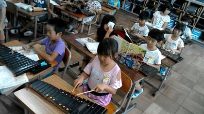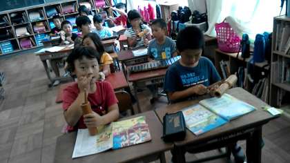 2年2組の音楽の授業です。「むしのこえ」の曲に合わせて,いろいろな楽器でリズム打ちをしました。色々な楽器の音が聞こえて,とても賑やかな雰囲気です。