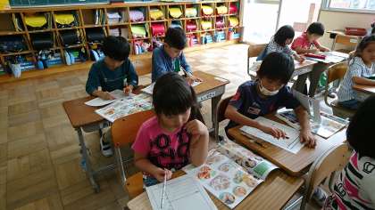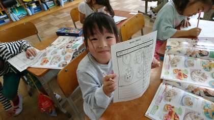 1年3組の図工です。単元「ごちそうパーティーをはじめよう」の制作に向けて,アイデアスケッチをしています。