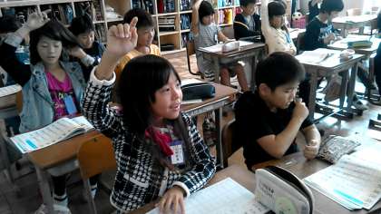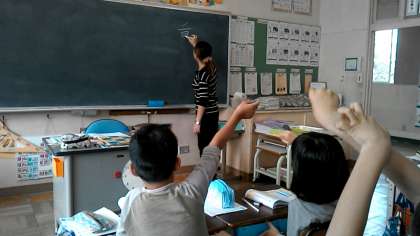 3年2組の国語の授業です。新しく習う漢字の,書き順をみんなで確認です。