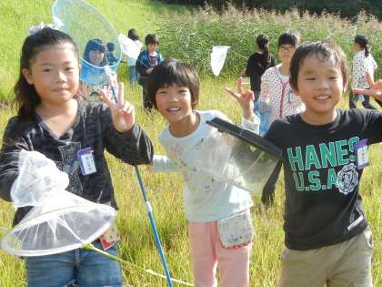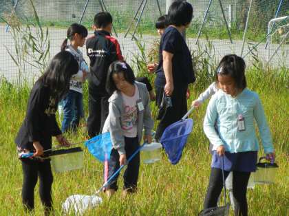 3年生は、1クラスずつ、大同グランドの北側の草原で虫取りをしました。トンボやバッタをがんばってとりました。バッタは、かわいい大きさのものが多かったです。観察をして、勉強します。