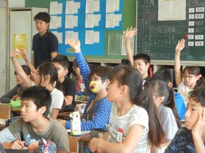10/10 6年生 外国語活動 公開日 2017/10/10 更新日 2017/10/10 6年生 6年3組は、ALTミラ先生と、外国語活動をしていました。国旗の特徴や、国の有名な建物、遺跡などを見て、それぞれの国の勉強をしました。ミラ先生のクイズで「red circle」はどの国ですか?「日本」です。本物の発音は、違います。よく聞かないと分からないときがあります。