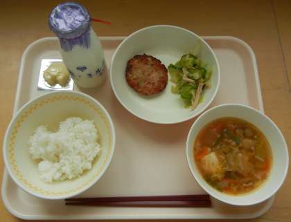 ごはん ぎゅうにゅう ピリカラじる キャベツ入りつくね バンサンスー かたぬきチーズ