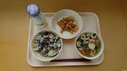 にくひじきごはん ぎゅうにゅう だいずとじゃがいものあまから すいとん
