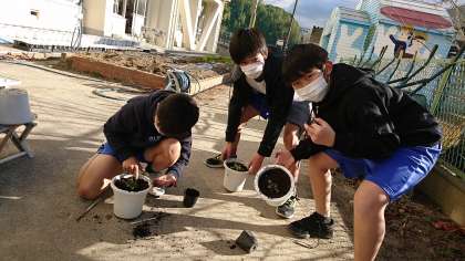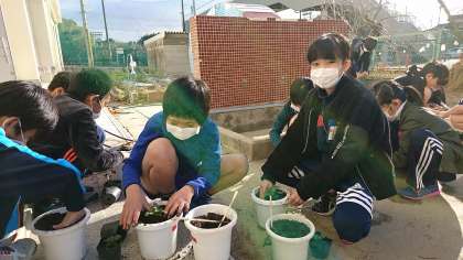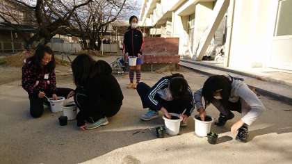 5年3組の一人一鉢の様子です。卒業式に向けて,式場を飾る植木鉢の準備をしました。