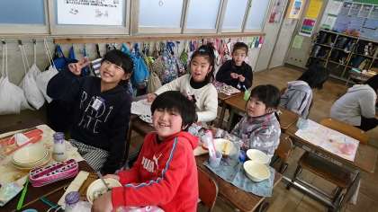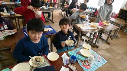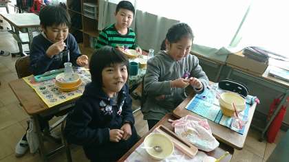 3年3組の給食です。インフルエンザ対策で前向き給食は継続中です。