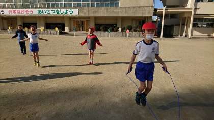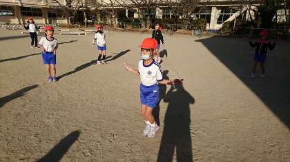 2年2組の体育です。校庭で縄跳びを頑張りました。