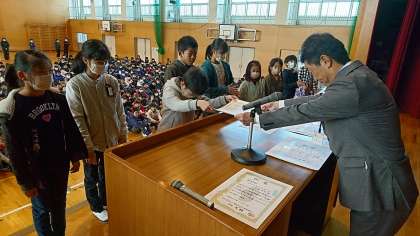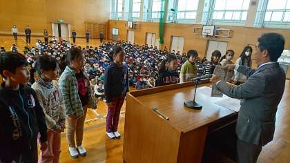 2週間ぶりの体育館での朝礼でした。今日は表彰がたくさんありました。