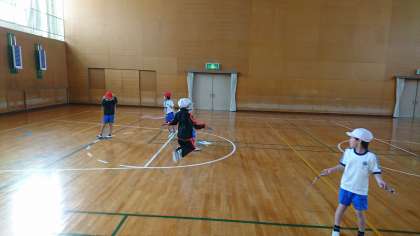 1年3組の体育です。長縄と短縄の練習を頑張りました。
