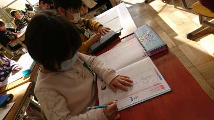 1年2組の書写の授業です。今日は書き初めということで,「お正月」の字を書きました。
