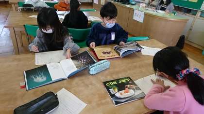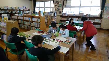 3年1組の国語です。単元「科学読み物を紹介しよう」に取り組んでいるので,図書室で調べものです。