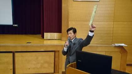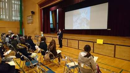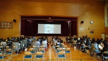 体育館では,保護者の方に岡田小学校の生活などについて説明を行いました。