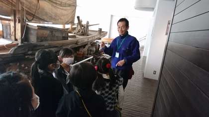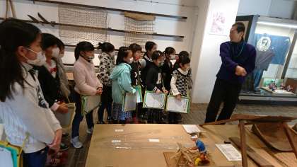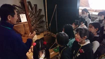 昔に使われていた農具の説明をしていただきました。足踏み水車や千歯こきなど,工夫された道具がたくさんありました。