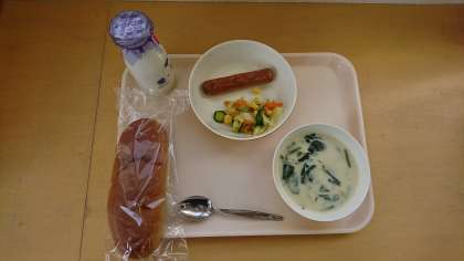 くろロール ぎゅうにゅう ほうれんそうのシチュー フランクフルト コールスローサラダ