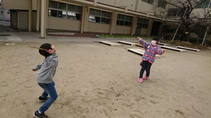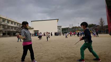 1年1組の生活科です。昔の遊びについて学んで,羽根つきを体験しました。