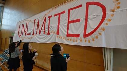 体育館開場いたしました。卒業生の手形にはメッセージが書かれています。
