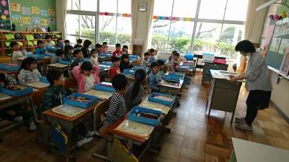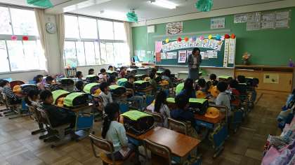 1年生が登校しました。先生のお話をお行儀よく聞いています。