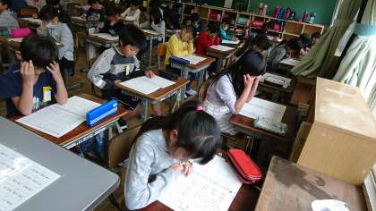3年2組の学力テストの様子です。みんな真剣な表情で問題を解いています。