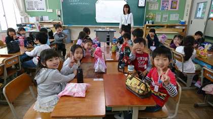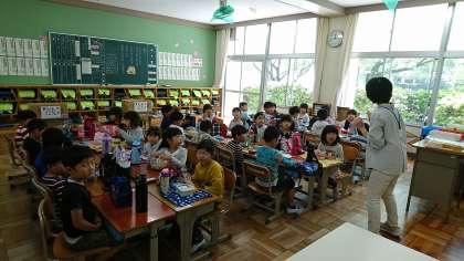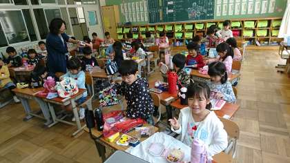 1年生は今日初めて,岡田小学校でお昼ごはんを食べます。今日はお弁当です。