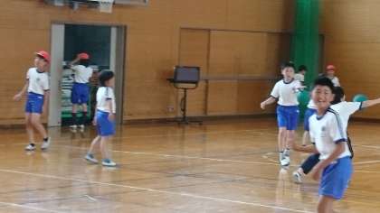 5年1組の体育です。集団行動の練習をした後で,ドッジボールをしました。