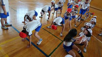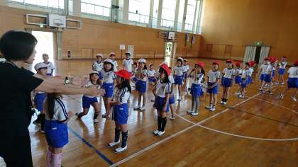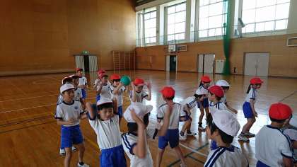 3年1組の体育です。ボール運びゲームを,みんなで楽しみました。
