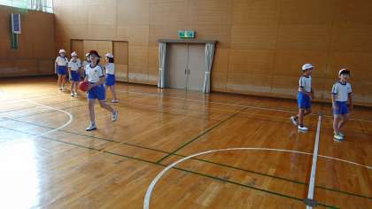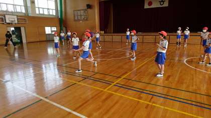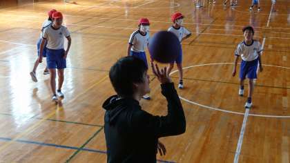 6年1組の体育です。体育館全体を使ってドッジボールをしました。