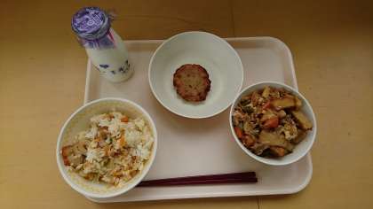 ぎゅうにゅう きりぼしだいこんいりまぜごはん なまあげとたけのこのうまに キャベツいりつくね