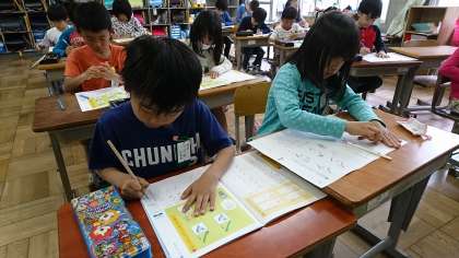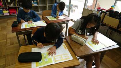 2年2組の書写です。片仮名の「ソ」と「ン」など,よく似た字の書き方に気をつけて練習しました。