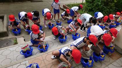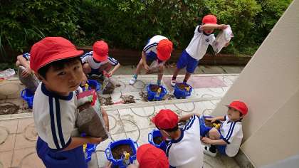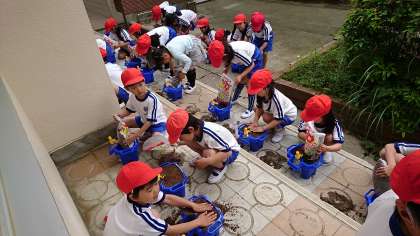 1年3組の生活科です。アサガオの種を植木鉢に植えました。