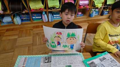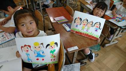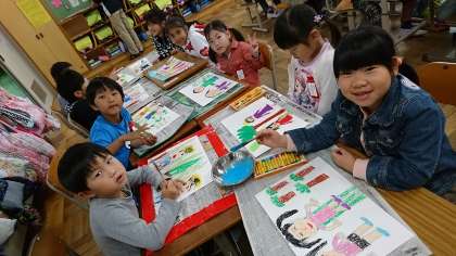1年2組の図工です。ペア遠足の絵がいよいよ完成です。