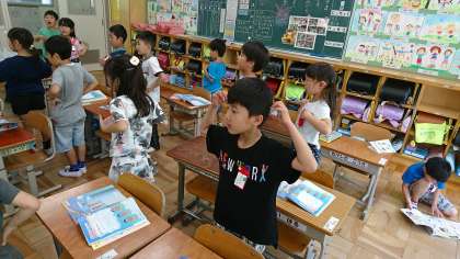 1年1組の音楽です。「ドレミの歌」を振り付けをしながら楽しく歌いました。