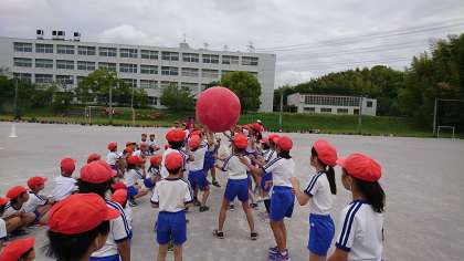 1〜3年生は大玉を転がし,4〜6年生は持ち上げて運びます。
