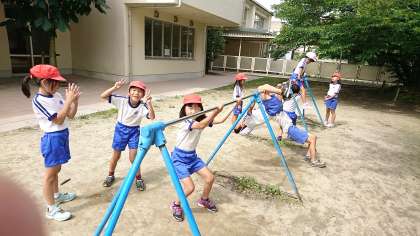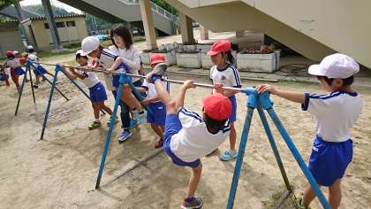 2年2組の体育です。鉄棒運動を頑張っています。