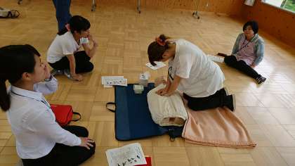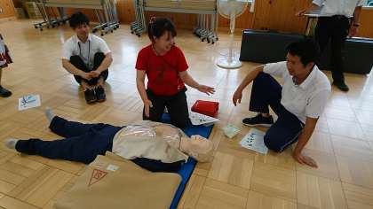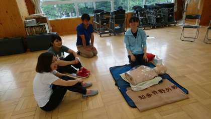 知多消防署から消防士の今井様と古川様をお招きして,心肺蘇生法とAEDの使い方を教えていただきました。