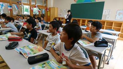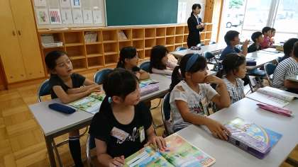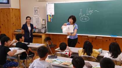 3年1組の外国語活動です。担任の先生も一緒に,元気よく発音の練習をしていました。