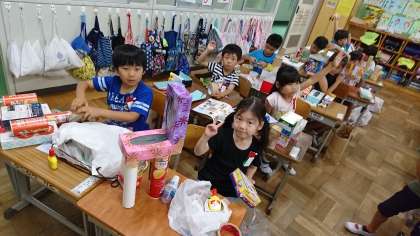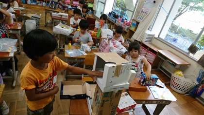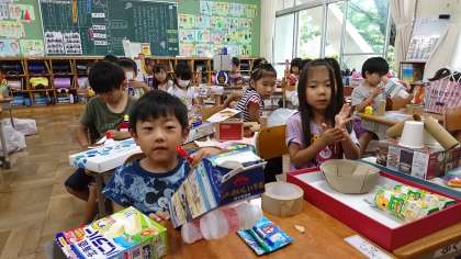 1年2組の図工です。「はこでつくったよ」が,完成しました。
