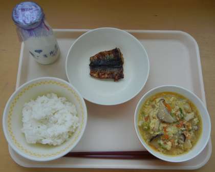 ごはん ぎゅうにゅう おやこに さんまのみりんやき れいとうみかん